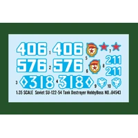 Item No                    84543 Item Name             Soviet SU-122-54 Tank Destroyer Bar Code                  6939319245434 Scale          1:35 Item Type                Plastic Model Armor Kit Model Dimension                Length: 287.9mm   Width: 102.4mm Total Plastic Parts                 530+ Total Sprues           18 sprues , upper hull and lower hull Chromeplate Parts              n/a Resin Parts              n/a Metal Parts             copper cable Photo Etched Parts              1 piece Film Accessory      n/a Released Date       2018-12 More Features      the kit consists of over 530 parts - Two-directional slide moulded lower hull & upper hull - individual tracks links -  photo-etched parts included