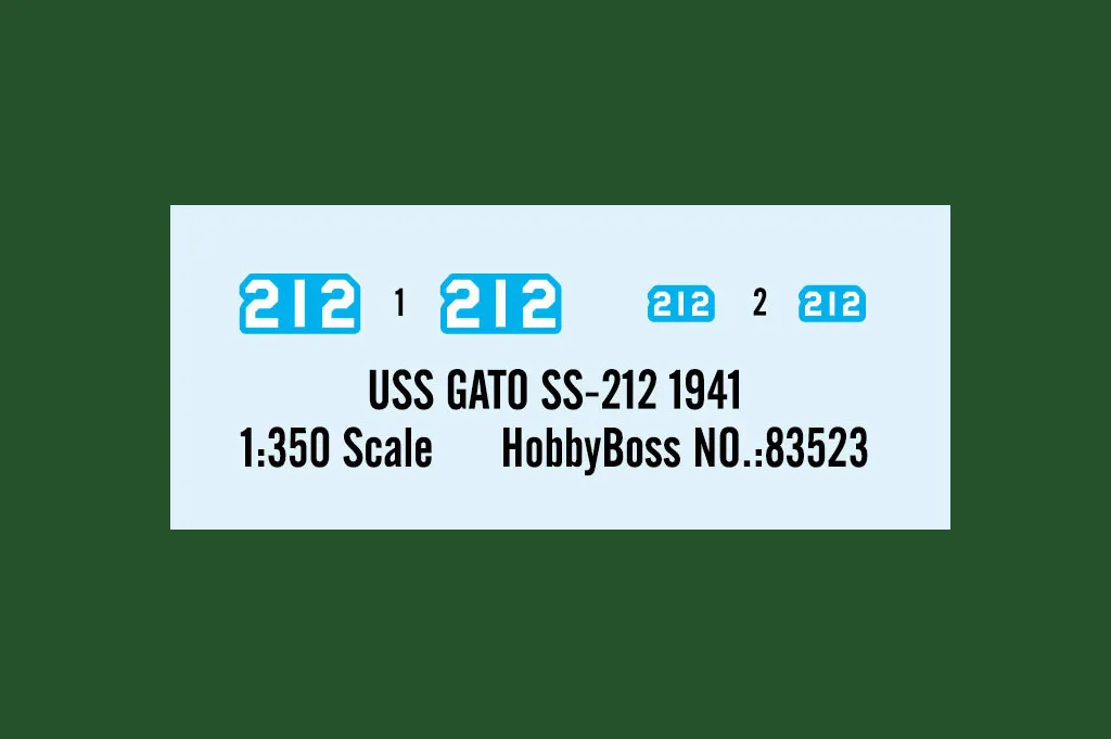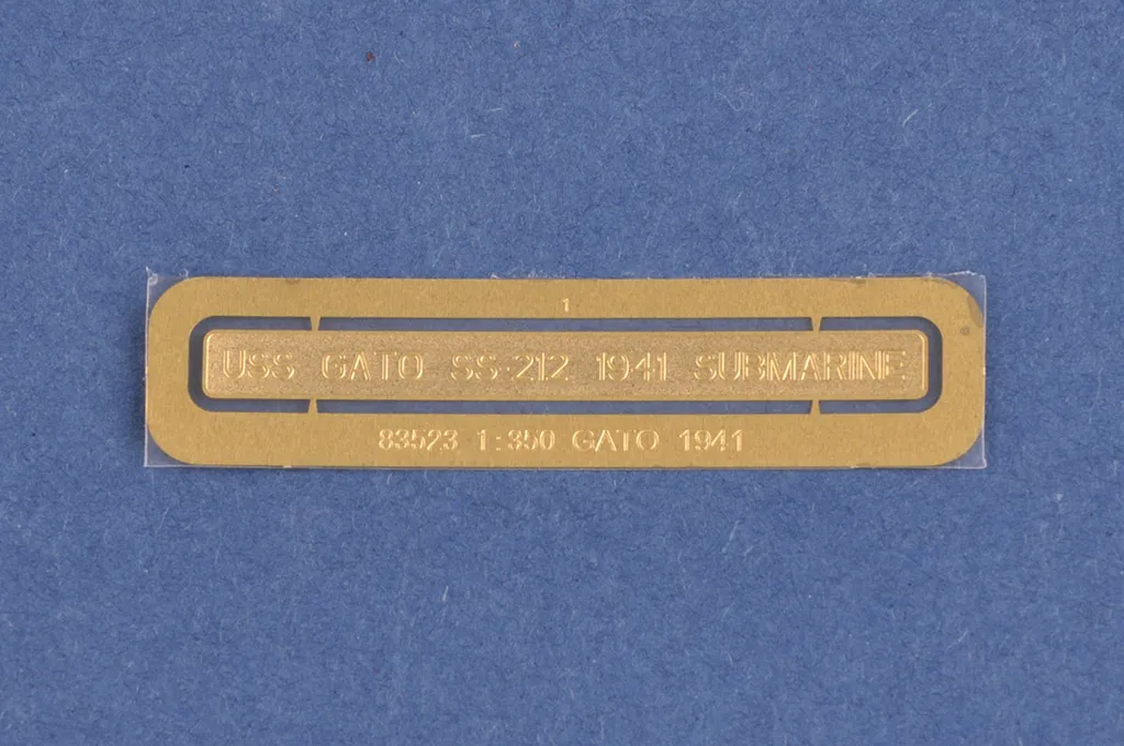 Item No 83523 Item Name USS GATO SS-212 1941 Bar Code 6939319235237 Scale 1:350 Item Type Plastic Model Warship Kit Model Dimension Length: 271.5mm   Beam: 24.7mm Total Plastic Parts 20+ Total Sprues 3 sprues and stand Chromeplate Parts n/a Resin Parts n/a Metal Parts n/a Photo Etched Parts 1 piece Film Accessory n/a Released Date 2021-06 More Features The kit consists of  over 20 parts - Photo Etched parts for nameplate - contains display stand