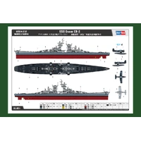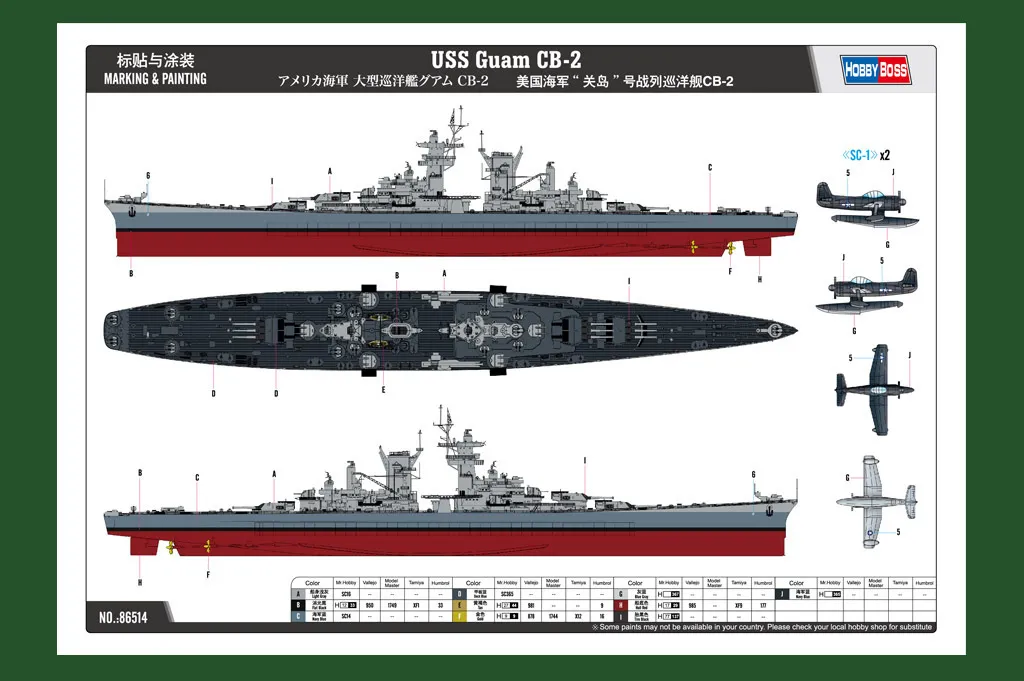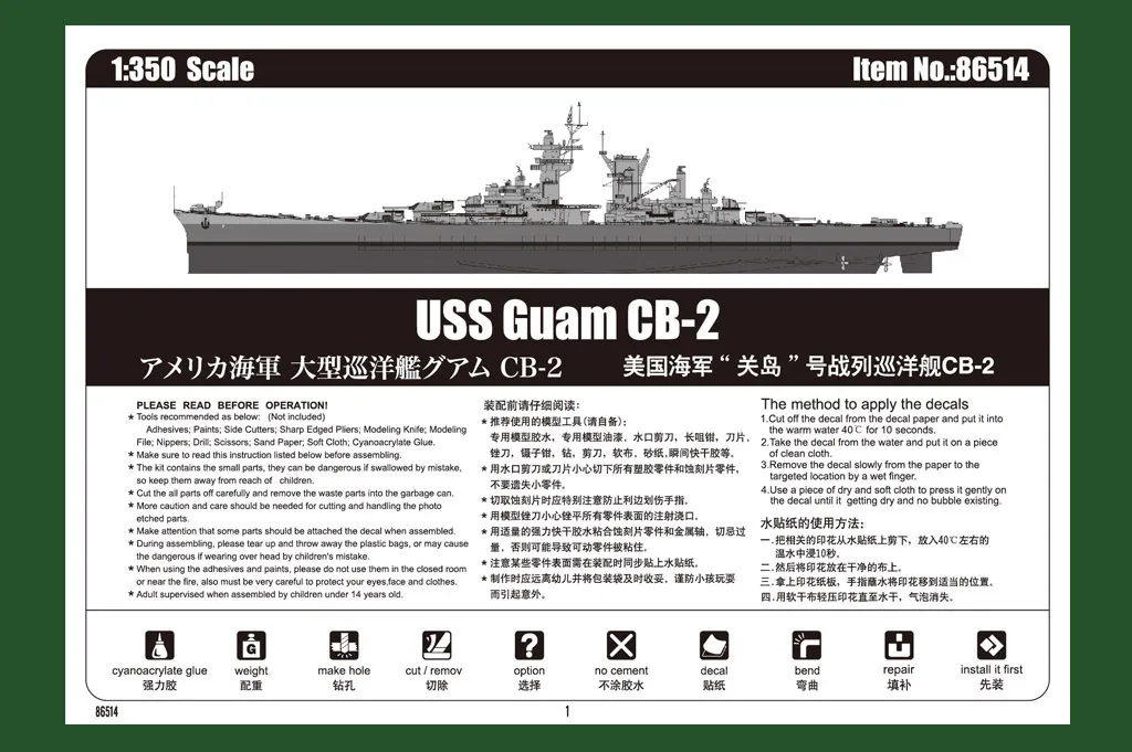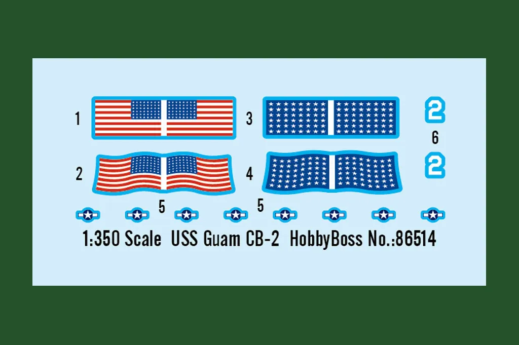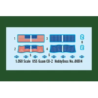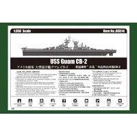 Item No 86514 Item Name USS Guam CB-2 Bar Code 6939319265142 Scale 1:350 Item Type Plastic Model Warship Kit Model Dimension Length: 704mm Beam: 80.4mm Total Plastic Parts 1150+ Total Sprues 17 sprues , hull , decks and stand Chromeplate Parts n/a Resin Parts n/a Metal Parts anchor chain Photo Etched Parts 4 pcs Film Accessory n/a Released Date 2017-09 More Features hull made from multi-directional slide moulds. - Deck wood pattern finely rendered - Contains 2 SC-1 plane - Contains display stand and engraved name plate - Photo-etched frets included