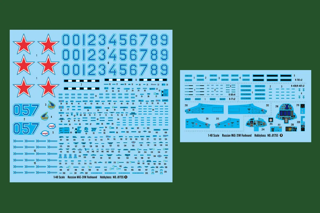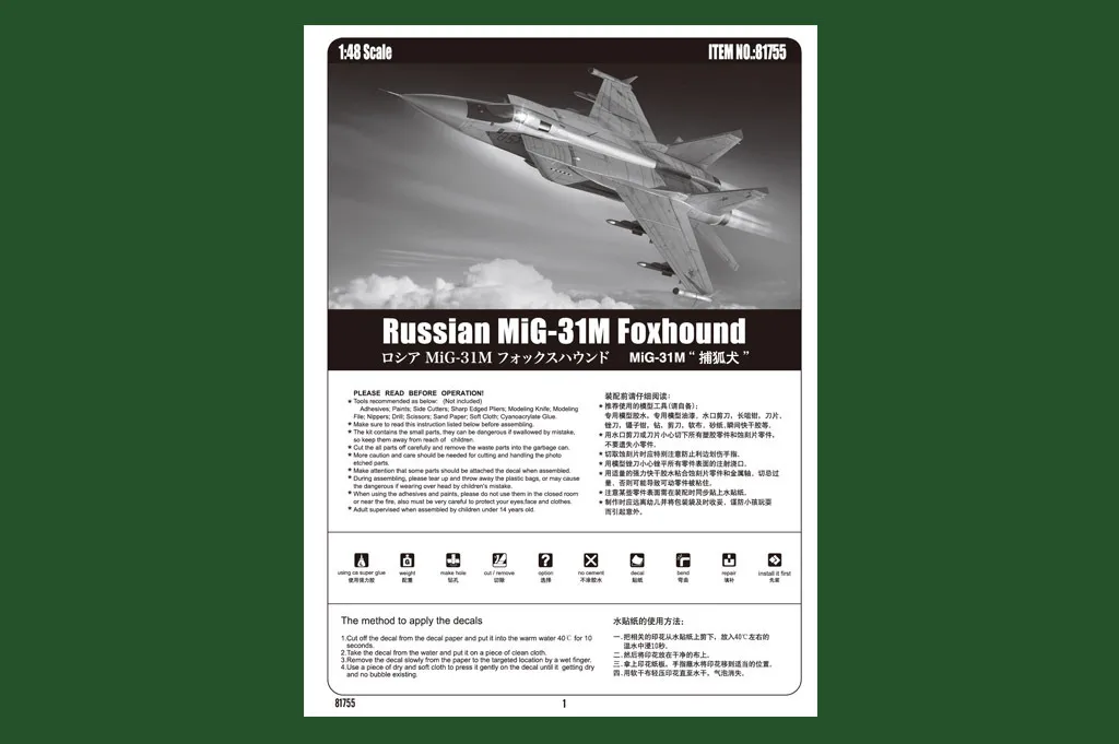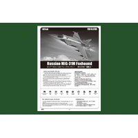 Item No 81755 Item Name Russian MiG-31M Foxhound Bar Code 6939319217554 Scale 1:48 Item Type Plastic Model Aircraft Kit Model Dimension Length: 472.3mm   Wingspan: 280.3mm Total Plastic Parts 370+ Total Sprues 30 sprues , tires and fuselage Chromeplate Parts n/a Resin Parts n/a Metal Parts gear strut Photo Etched Parts 1 piece Film Accessory n/a Released Date 2017-10 More Features the kit consists of over 370  parts -Detailed fuselage&wing w/accurate design -Detailed cockpit -metal undercarriage -rubber tires -photo etched parts included