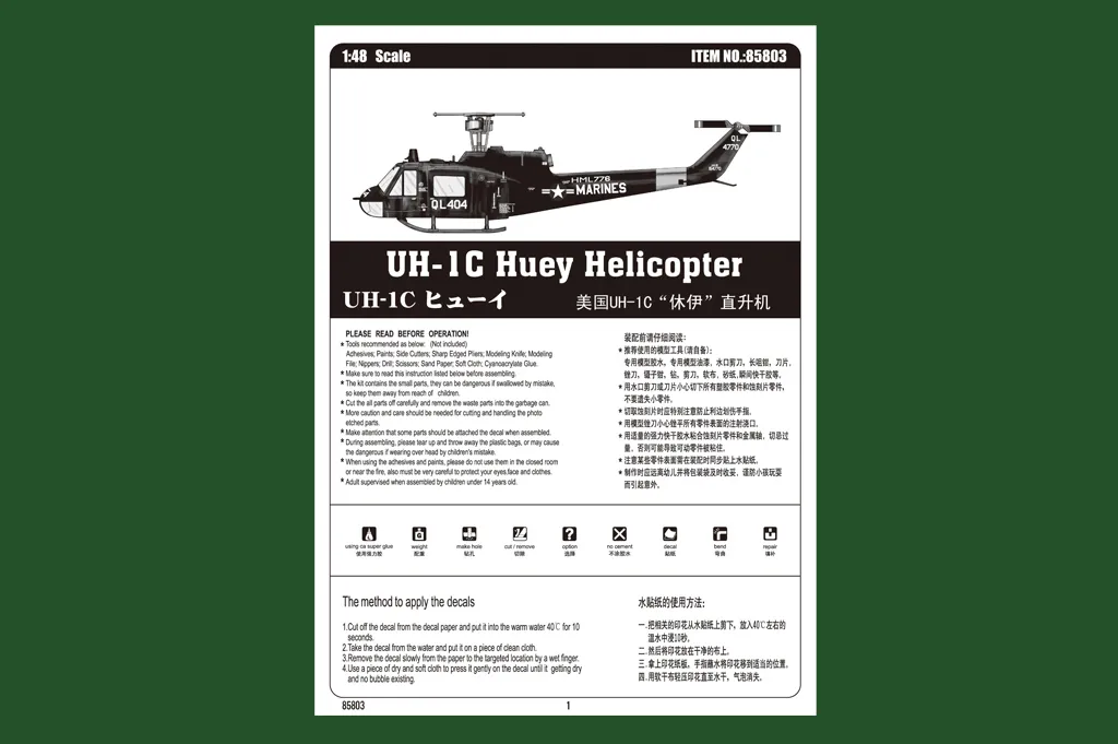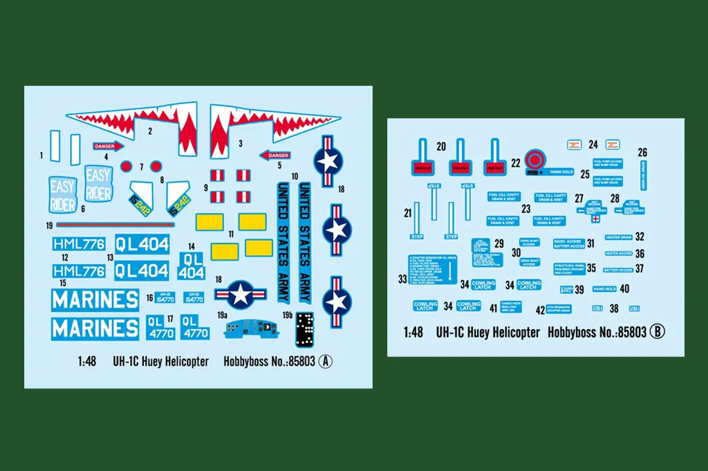 SKU: HB85803 | Brand: HobbyBoss | Product: HobbyBoss 1/48 UH-1C Huey Helicopter Plastic Model Kit [85803] The Bell UH-1 Iroquois gained its "Huey" designation from its original HU-1 classification and became a cornerstone of military aviation after entering service in 1959. Over 16,000 units were manufactured through 1976, with approximately 7,000 deployed during the Vietnam War across multiple operational roles. This 1:48 assembly model comprises 30+ parts distributed across 2 fuselage sprues and includes 5 clear canopy sections with finely detailed panel lines (272.6mm length, 255mm rotor diameter). Constructed in US Army configuration. Static assembly required; paints and cement not supplied. Item No: 85803 | Scale: 1:48 | Released: 2012-06