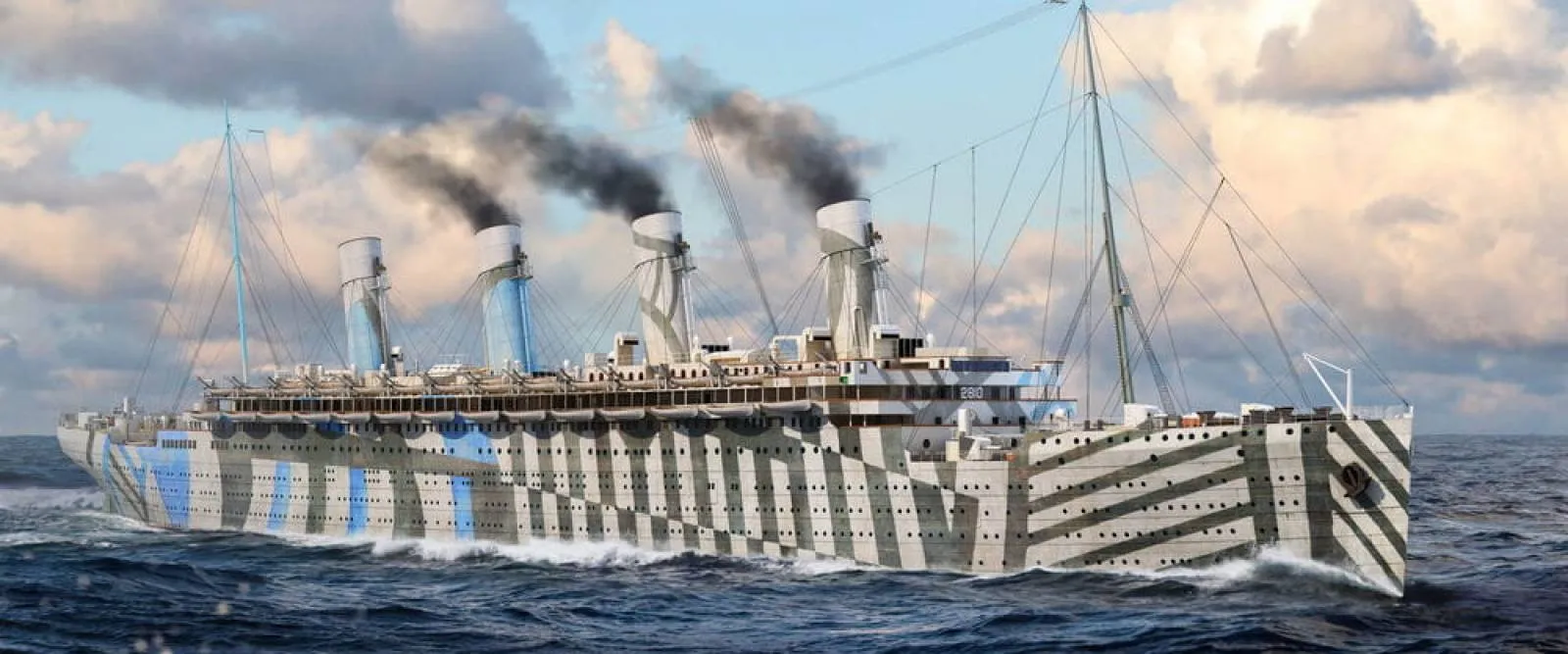 In World War I, the Olympic requisitioned by the Royal Navy as a troop transport equipment and some artillery, and the appearance of painted camouflage.Olympic on the way May 12, 1918 return to Southampton found German submarine U-103, because the camouflage paint played a confusing role, U boat is no way to launch an effective attack, eventually striking submarine captain ordered the Olympic, 800 tons submarines will soon be split more than 40,000 tons of cruise。