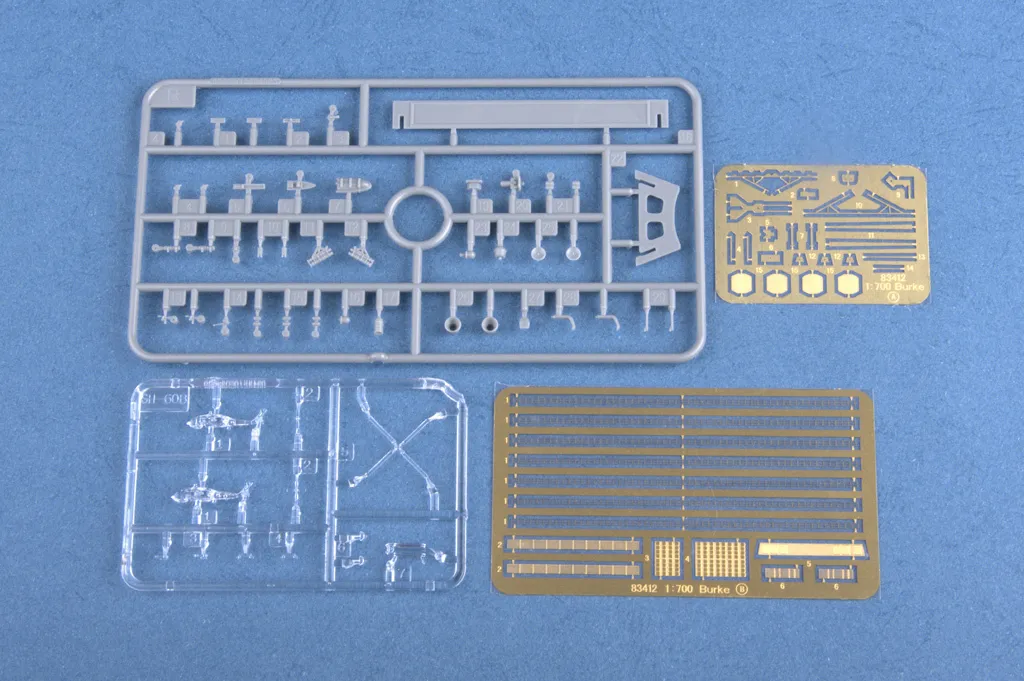 Item No 83412 Item Name USS Lassen DDG-82 Bar Code 6939319234124 Scale 1:700 Item Type Static kit Model Dimension Length: 219.8mm Beam: 32.5mm Total Plastic Parts 180+ Total Sprues 5 sprues, upper hull, lower hull, superstructure , decks and waterline plate Chromeplate Parts n/a Camouflage Scheme USS Lassen DDG-82 Resin Parts n/a Metal Parts n/a Photo Etched Parts 2 pcs Film Accessory n/a Released Date 2013-01 More Features - upper hull made from multi-directional slide moulds. - Separate sonar due to her sphere. - Either full hull version or waterline version can be selected. - Two SH-60B included - Contains display stand and name plate - Photo-etched frets for handrails etc.