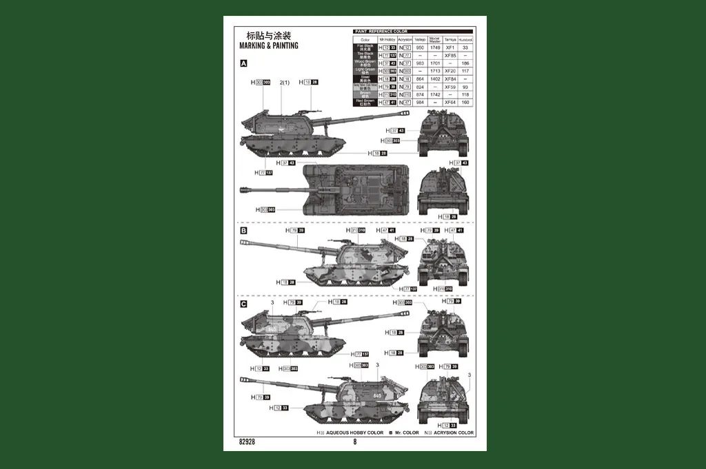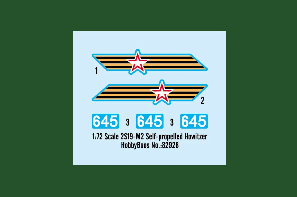Item No 82928 Item Name 2S19-M2 Self-propelled Howitzer Bar Code 6939319229281 Scale 1:72 Item Type Plastic Model Armor Kit Model Dimension Length: 103.2mm   Width: 50.3mm Total Plastic Parts 40+ Total Sprues 2 sprues , upper hull , lower hull and tracks Chromeplate Parts n/a Resin Parts n/a Metal Parts n/a Photo Etched Parts n/a Film Accessory n/a Released Date 2022-09 More Features The kit consists of over 40 parts -Newly tooled parts in accurate detail