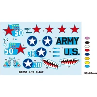Parament Item No 80250 Item Name P-40E Kitty hawk Bar Code 6939319202505 Scale 1:72 Item Type Static Aircraft Model Brief Length: 132mm Wingspan: 155mm Height: 53mm Total Parts 30pcs Total Sprues 3pcs Camouflage Scheme 16 Fighter squadron, 23 Fighter Group, 1942. , 154 IAP , 1942.
