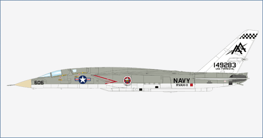 North American RA-5C 156624 was accepted by the USN in January 1970 and assigned to Reconnaissance Attack Squadron 6 (RVAH-6) “Fleurs” for 1970 and 1971 on a cruise aboard USS Kitty Hawk (CV-63). Over the next 7 years the aircraft moved to RVAH-5 “Savage Sons”, RVAH-9 “Hoot Owls”, RVAH-12 “Speartips” before returning to RVAH-6 as AJ602. RA-5C 156624 made its final flight in mid-1978 and now displayed at the National Naval Aviation Museum at NAS Pensacola, Florida wearing AJ-601 from its last cruise aboard the USS Nimitz.
