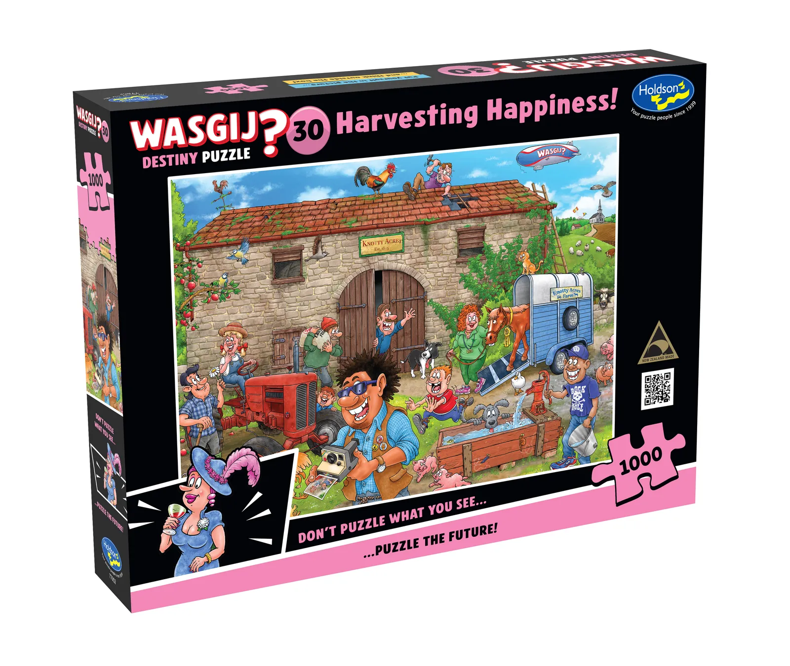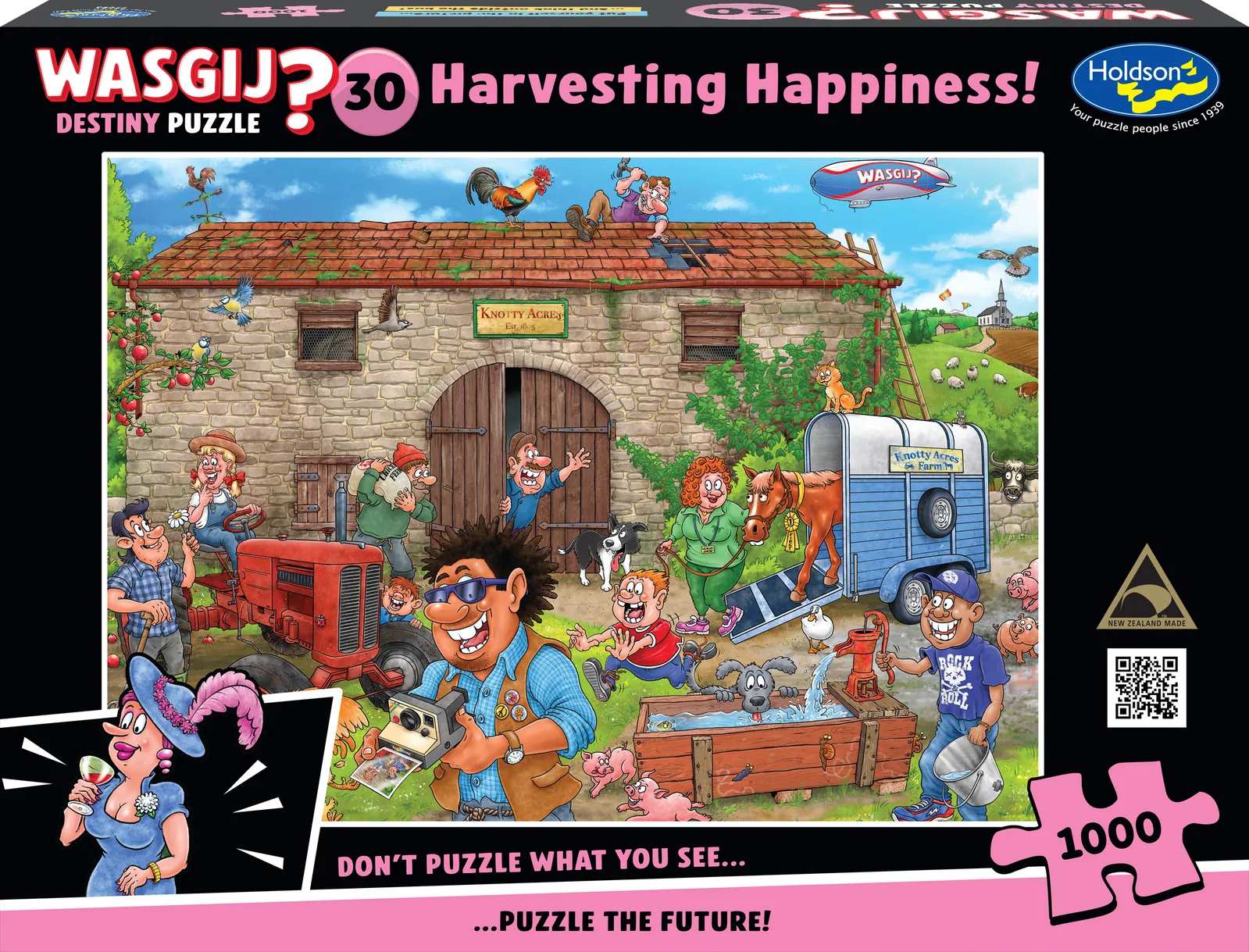 The Wasgij Destiny #30 1000 Piece Jigsaw - Harvesting Happiness is a "puzzle the future" concept where you use clues to imagine and build what the farmyard scene on the box would look like in the modern day. Unlike traditional puzzles, you do not recreate the image on the box. Instead, you must use your imagination to piece together how the chaotic farmyard has transformed over time.