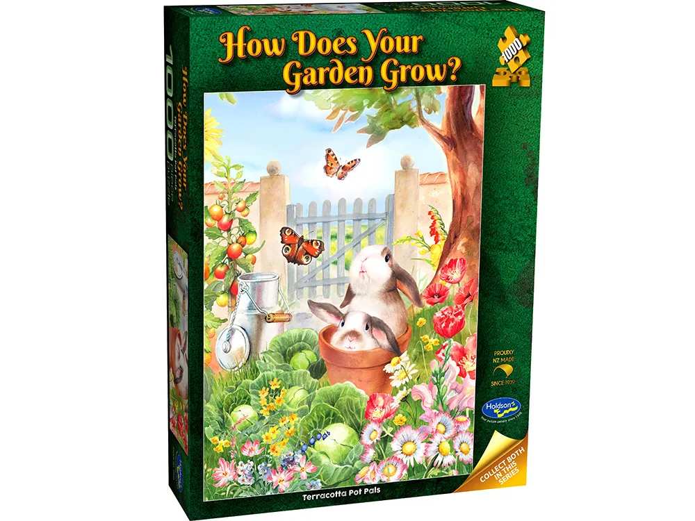 A 1000-piece jigsaw puzzle featuring playful rabbits in a terracotta pot garden. It is part of the "How Does Your Garden Grow" series by the brand Holdson. The other title in the series is Crate Buddies. The puzzle is designed for ages 8 and up, with dimensions of 49cm x 68cm, and is made in New Zealand using vegetable-based inks.