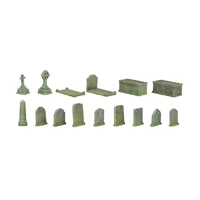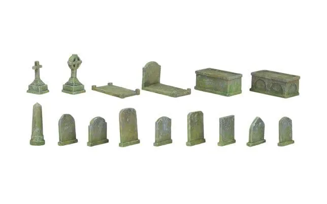 Add authentic cemetery detail to your scale layout with this collection of 15 assorted gravestones and monuments from Hornby's Skaledale range. Each highly detailed resin piece features realistic texturing and weathering in subdued grey tones, perfect for creating atmospheric graveyards or church scenes. These carefully crafted monuments provide the perfect finishing touch for period layouts, offering modellers the opportunity to create poignant corner scenes or complete cemetery dioramas with impressive scale accuracy.
