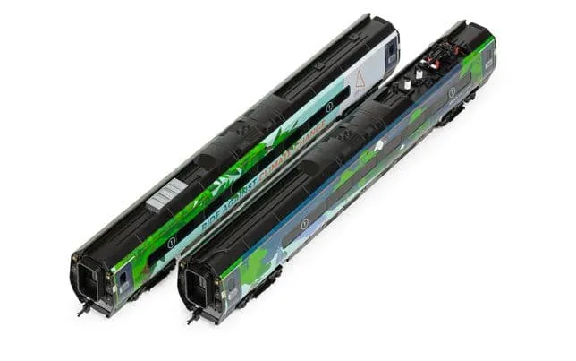 This Class 390 Coach Pack, in its striking Climate Change livery, includes First Class trailer car J and Standard trailer car U.