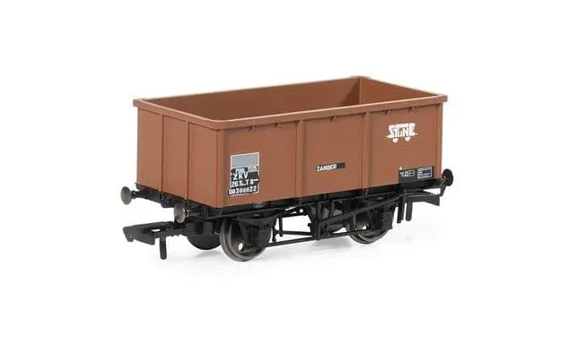 A ZKV Zander wagon is used to represent transporting iron ore on the BR network. This model comes in a bauxite livery to represent one of the numerous ZKV Zander wagons that were unpainted. Each vertical rib has box sections.