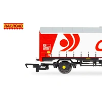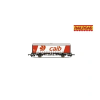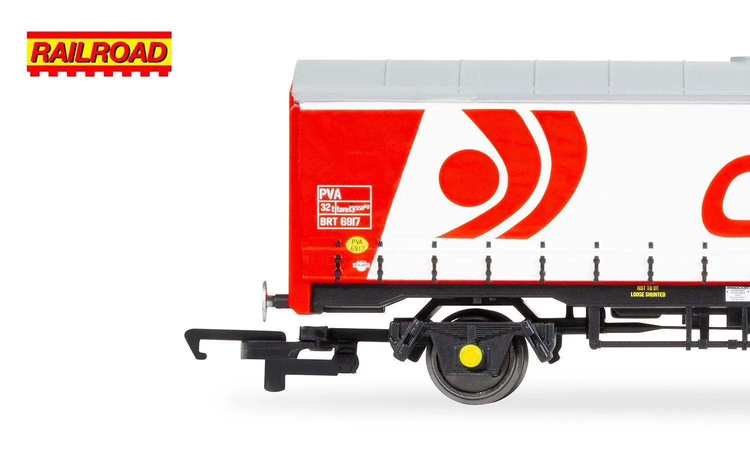The model features a PVA curtain sided van with the side featuring a white CAIB livery. It incorporates fixed tension couplings for easier coupling to other locomotives and rolling stock.