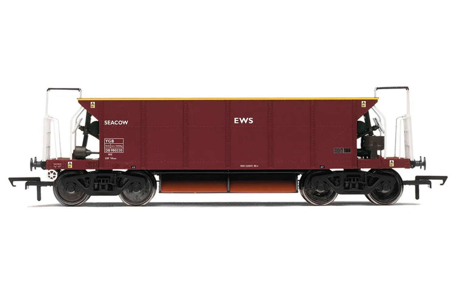 This ‘Seacow’ wagon model features box sections in the vertical ribs to reflect a later variation. The hook couplings enable easier coupling of other rolling stock and locomotives on your layout. Stanchions support the wagon in an MGR Hopper style. A handbrake wheel is also featured. This model comes in an EWS livery.