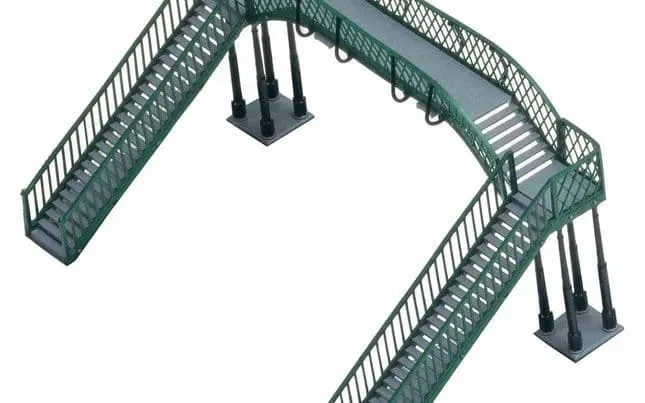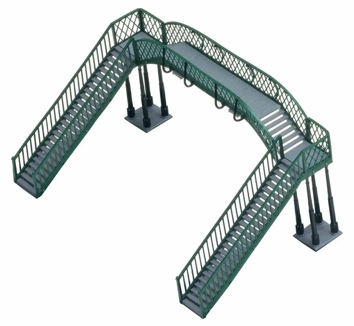 This Footbridge from Hornby is a detailed station accessory featuring realistic railings and spanning two tracks, allowing for authentic platform-to-platform crossing scenarios. Designed for push-fit assembly, this resin structure can be positioned between platforms or as a free-standing trackside element, adding context to any layout. Please note, platform sections are not included with this model.