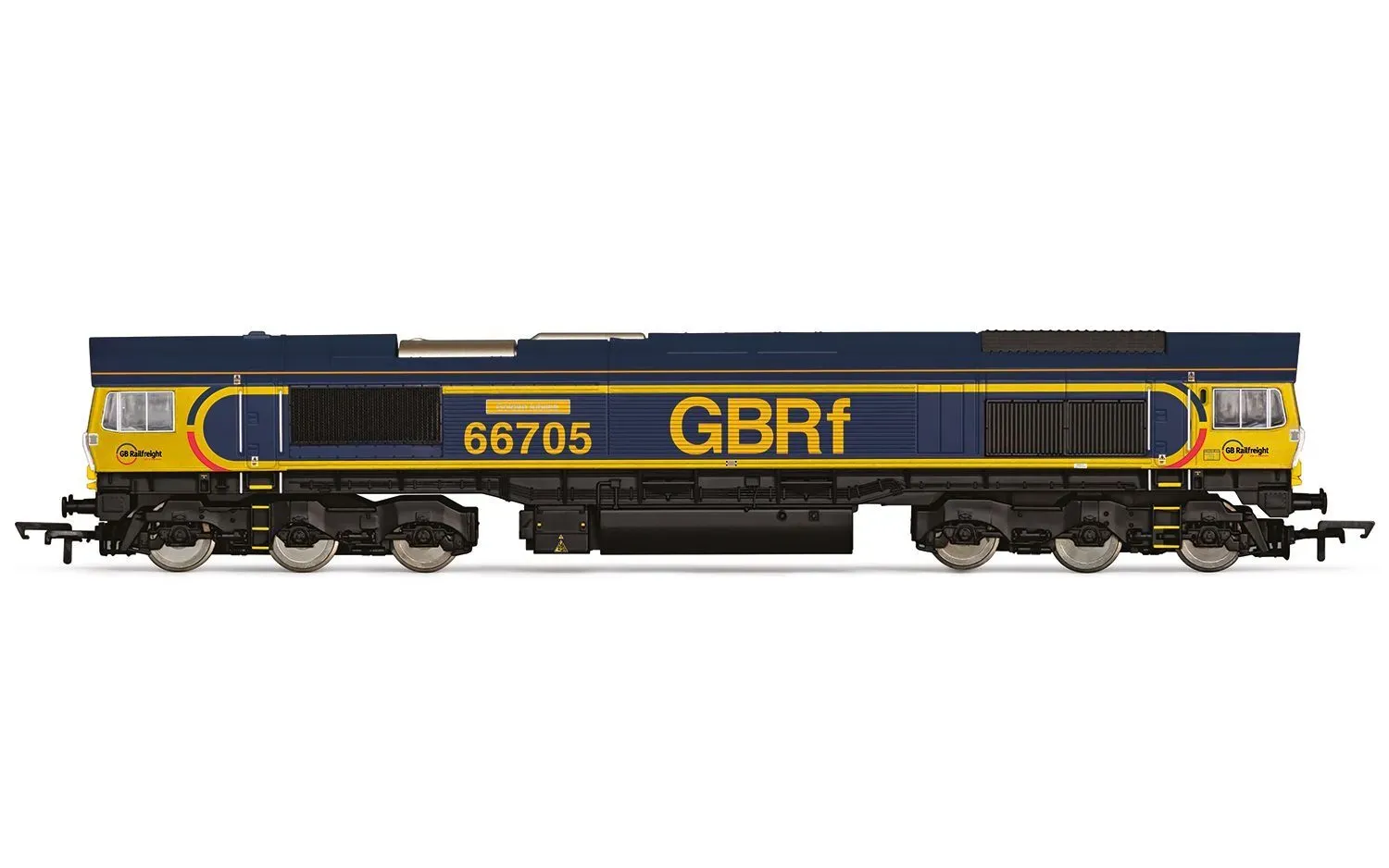 Our model of No. 66705 features the iconic GBRf blue livery. It includes two etched nameplates with 'Golden Jubilee' on a golden background. Please be aware that this is not suitable for children. This model is DCC-ready and compatible with our HM7000 21-pin decoder. Additionally, the accessory bag includes a pair of snow ploughs, four vac pipes, and two moulded coupling links.