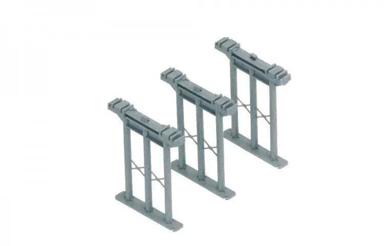 These High Level Piers provide essential support for elevated track sections on OO gauge layouts. Supplied as a pack of three grey supports, they allow for impressive height variations of up to 80mm. When positioned at 24 sleeper intervals, they create a running length of approximately 1344mm, while spacing at 30 sleeper intervals extends this to 1680mm for more gradual inclines. Designed with integrated grooves compatible with R660 Elevated Track Sidewalls, these piers offer modellers flexibility when creating dynamic multi-level railway scenes.