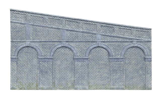 These High Stepped Arched Retaining Walls replicate Engineers Blue Brick styling for OO gauge layouts. This pack contains two retaining wall sections designed for creating railway cuttings or the beginning of embankments in your model railway scenery, offering an effective retention solution for your landscape. Add an architectural twist to your layout with these detailed blue brick structures that help create realistic depth and dimension in your model railway scenes. These retention pieces interlock with other scenery elements to build impressive landscape features.