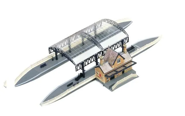 This OO gauge model Station Terminus from Hornby provides the perfect centrepiece for modern town or city layouts at scale. The comprehensive set features twin platforms with detailed over-roof sections, a fully-realised booking hall, approach steps, and subway access, creating a complete modern passenger station complex. This station includes all necessary components for build and assembly and comes with a detailed transfer sheet for authentic signage and markings. The kit's modular design allows for flexible integration with existing Hornby track systems and mainline configurations, making it an essential addition for enthusiasts looking to improve their railway diorama with contemporary infrastructure.