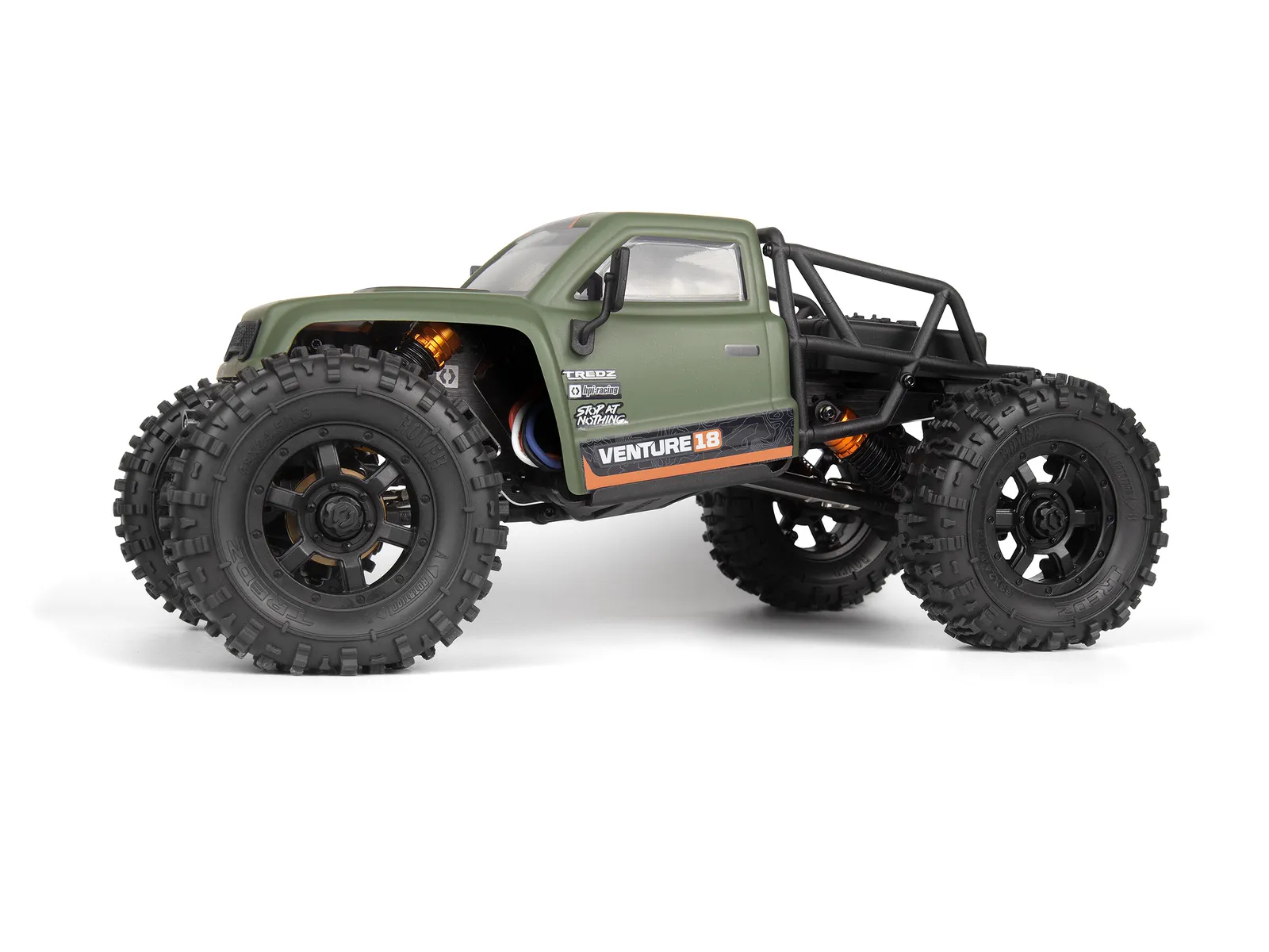 The Venture18 CC features a meticulously crafted Ridgeline Half Cab body, designed to impress with its detailed realism and rugged style. Highlights like the grille, mirrors, rear roll cage, and tank add to its authentic appearance and enhance the overall aesthetic, making your Venture18 CC stand out in any setting.