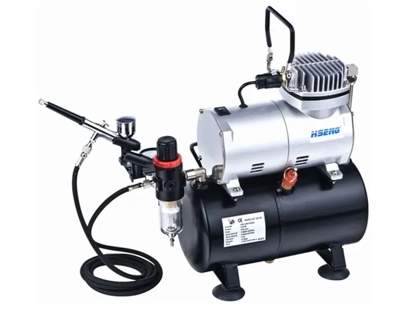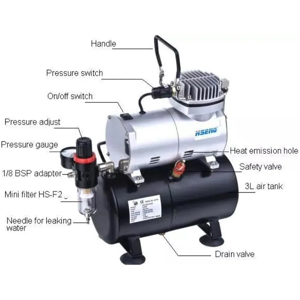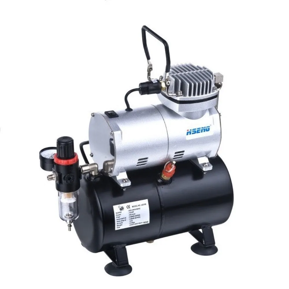 HSENG Airbrush Compressor Kit Model No. AS186K. Piston Type. Includes compressor, air hose and airbrush.