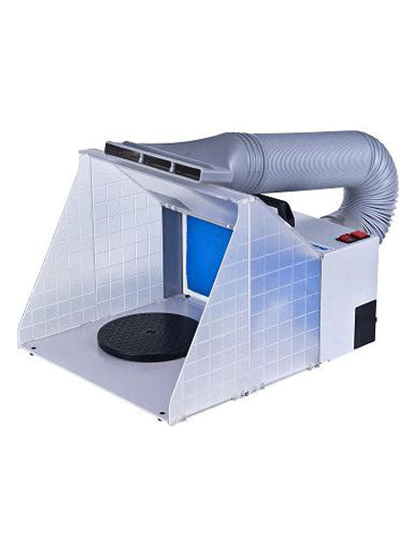 Working area (not including extraction unit itself) measures: 48cm wide x 42cm deep x 36cm tall (max) Quiet and powerful oil free motor (47db - Voltage 100-240v 50/60HZ Approx 25w) Fitted with a 35mm foam filter which is optimised for paint capture whilst maintaining the highest air flow.