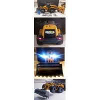 The Huina 1583 Wheeled Loader is a 10 channel, die cast metal RC bulldozer. The bucket loader can move forward, backward, turn left, turn right, 360 degrees rotary. With sound and lights and each joint can be independently controlled.