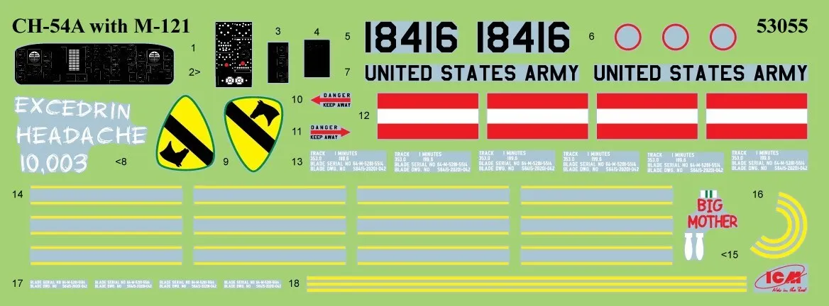Short DescriptionICM 1/35 Phu Bai Combat Base 1968. Sikorsky CH-54A Tarhe, 2 sets of figures, M-121 Bomb, Set of Landing Mat # 53056