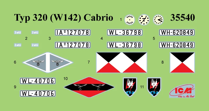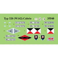 SKU: ICM35542 | Brand: ICM | Product: ICM 1/35 Typ 320 (W142) Cabriolet Soft Top WWII German staff car Plastic Model Kit Representation of the Mercedes-Benz 320 (W142) Cabriolet B featuring an open soft top configuration. The kit captures the authentic proportions of the vehicle body and convertible roof mechanism. Includes decal sheet with 4 distinct marking variants spanning 1940-1943 operations. The Mercedes-Benz W142 entered production in 1937 and remained in manufacture through 1942, with approximately 7,000 units built overall and roughly 1,800 allocated to German military service. The W142 succeeded the Type 290 model, introducing revised styling, higher-displacement engines, and enhanced specifications. Model dimensions measure 141 × 44 mm. Decal options represent: Typ 320 (W142) Cabriolet in France (1940), unidentified Luftwaffe unit (1940), Eastern Front service (1943), and NJG1 Nachtjagdgeschwader 1 marking (circa 1943).