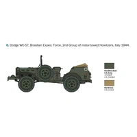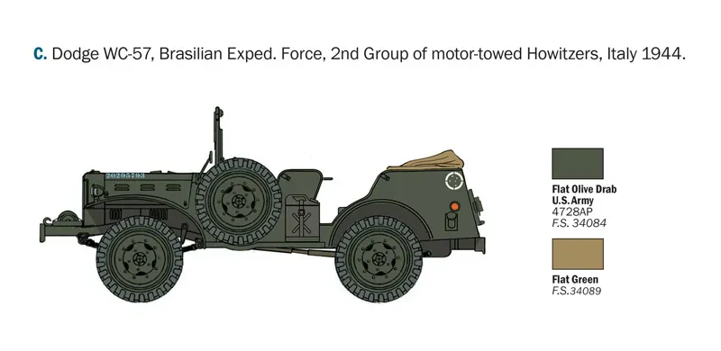 The Dodge WC range of military transport vehicles was mainly produced by American industry during the Second World War. The development of the WC 51-52 series aimed to create a light, four-wheel drive "utility vehicle", characterized by great reliability and flexibility in any environment and further enhanced by a good payload. The Dodge vehicle development project was extremely successful and together with the famous ¼ ton "Jeep" Willys, the Dodge WC ¾ ton "Beeps" was the most produced vehicle by American armament factories during the Second World War and which significantly contributed to the logistical needs of the United States Army on its various fronts. The Dodge vehicle with its good payload of almost 700 kg could be enhanced by the application of rear "trailers" and was produced in numerous versions and with different fittings including flatbed, open cab, troop, ammunition and armament transportation modes. The WC-56 version was specifically dedicated to communications and officer transportation tasks.
