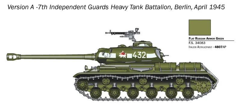 The IS-2 is a Soviet heavy tank from the Second World War. The first prototypes of this vehicle were built in 1943, and it entered service in the same year. 3400-3600 vehicles of this type were manufactured in the course of production. The combat weight of the tank was up to 46 tons. The drive was provided by a single W-2-IS diesel engine with a power of up to 520 HP. The basic armament consisted of the 122 mm D-25T gun and 3-4 machine guns: 1 12.7 mm DSzK rifle and 2-3 7.62 mm DT rifles.
