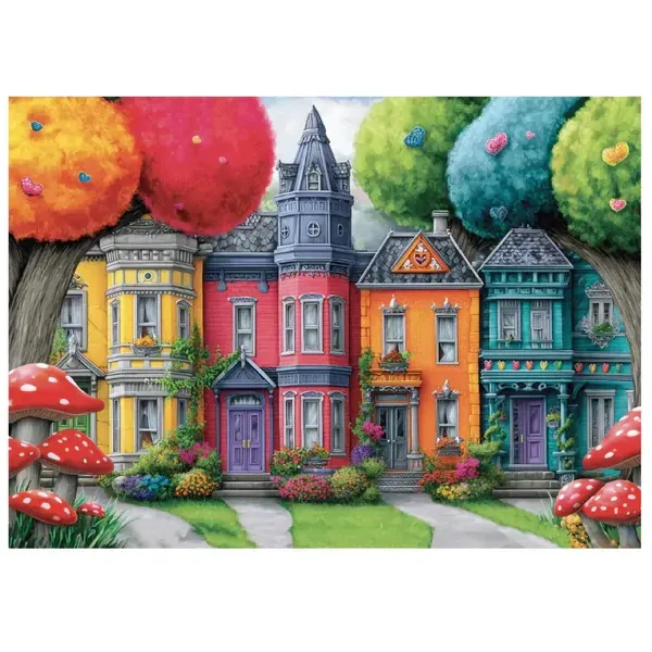 This delightful jigsaw puzzle features a row of vibrant homes framed by whimsical trees, blooming flowers, and playful details that bring the neighborhood to life. Each piece reveals new textures and hues, making this picture puzzle a joyful and relaxing escape. With its rich palette and inviting scene, this 1000 piece jigsaw puzzle is perfect for puzzlers who love colorful jigsaw puzzles, cozy townscapes, and puzzles for adults that feel uplifting and imaginative.