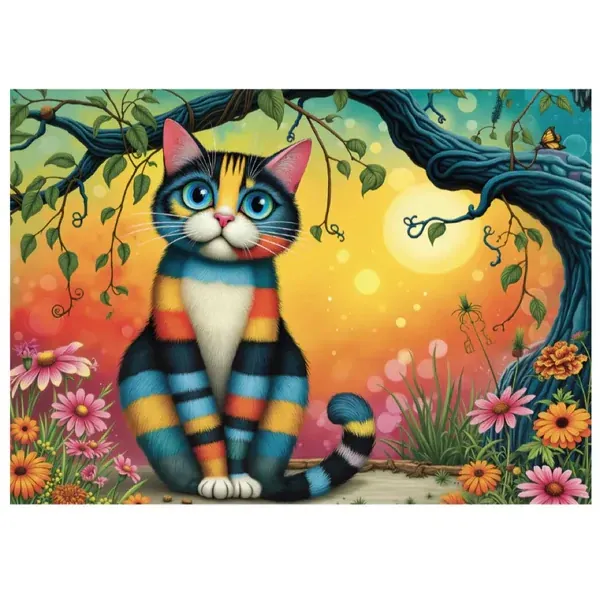 Bright, playful, and full of personality, this eye-catching jigsaw puzzle features an adorable cat with bold rainbow stripes set against a dreamy garden backdrop. With glowing colors, expressive eyes, and whimsical details, this picture puzzle is pure joy from the first piece to the last. Designed to delight cat lovers and art fans alike, this 1000 piece jigsaw puzzle offers a satisfying challenge while immersing you in a world of imagination and color. Perfect for relaxing evenings, creative escapes, or anyone who loves cat jigsaw puzzles and colorful jigsaw puzzles with a magical twist.