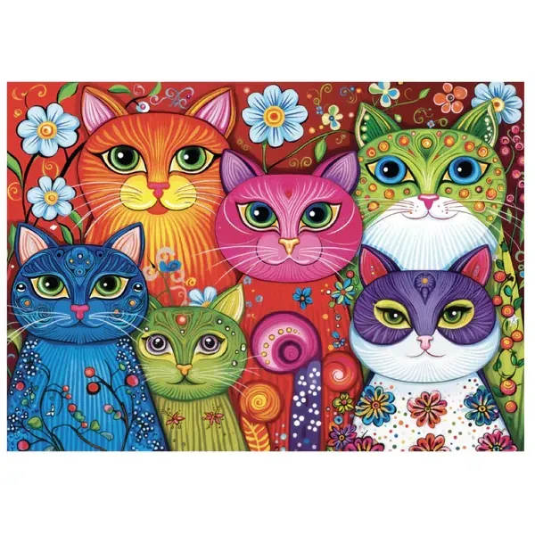 This eye-catching jigsaw puzzle features a delightful gathering of colorful cats, each decorated with intricate patterns, playful textures, and expressive eyes. Set against a vivid floral background, this picture puzzle turns every puzzling session into a lively and uplifting experience filled with color and creativity.