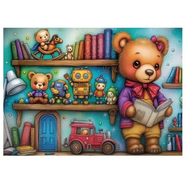 This delightful jigsaw puzzle invites you into a charming teddy bear’s room filled with books, toys, robots, vehicles, and tiny treasures waiting to be discovered. Every shelf tells a story, blending warmth, curiosity, and playful detail into a picture puzzle that feels comforting and joyful from the very first piece.