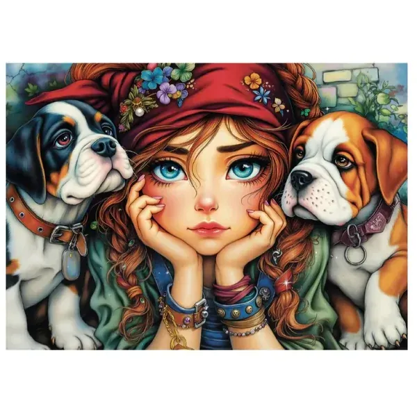 True Companions Nearby features a tender scene of a thoughtful young girl framed by two loyal dogs, capturing the deep bond between humans and their four-legged friends. With expressive eyes, rich textures, and a storybook-style illustration, this picture puzzle invites you to slow down and enjoy every detail as it comes together.