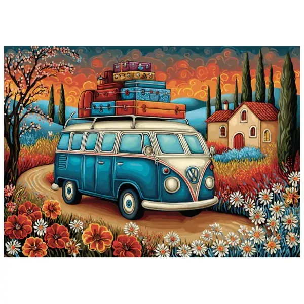 Van Life Escape captures the spirit of freedom and travel, featuring a classic van packed for the journey, winding through a colorful countryside filled with blooming flowers, rolling hills, and warm sunset skies. Every detail radiates wanderlust and relaxation, turning this picture puzzle into a mini getaway you can enjoy piece by piece. It’s a perfect choice for fans of beautiful puzzles who dream of slow travel, cozy escapes, and carefree exploration.