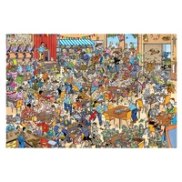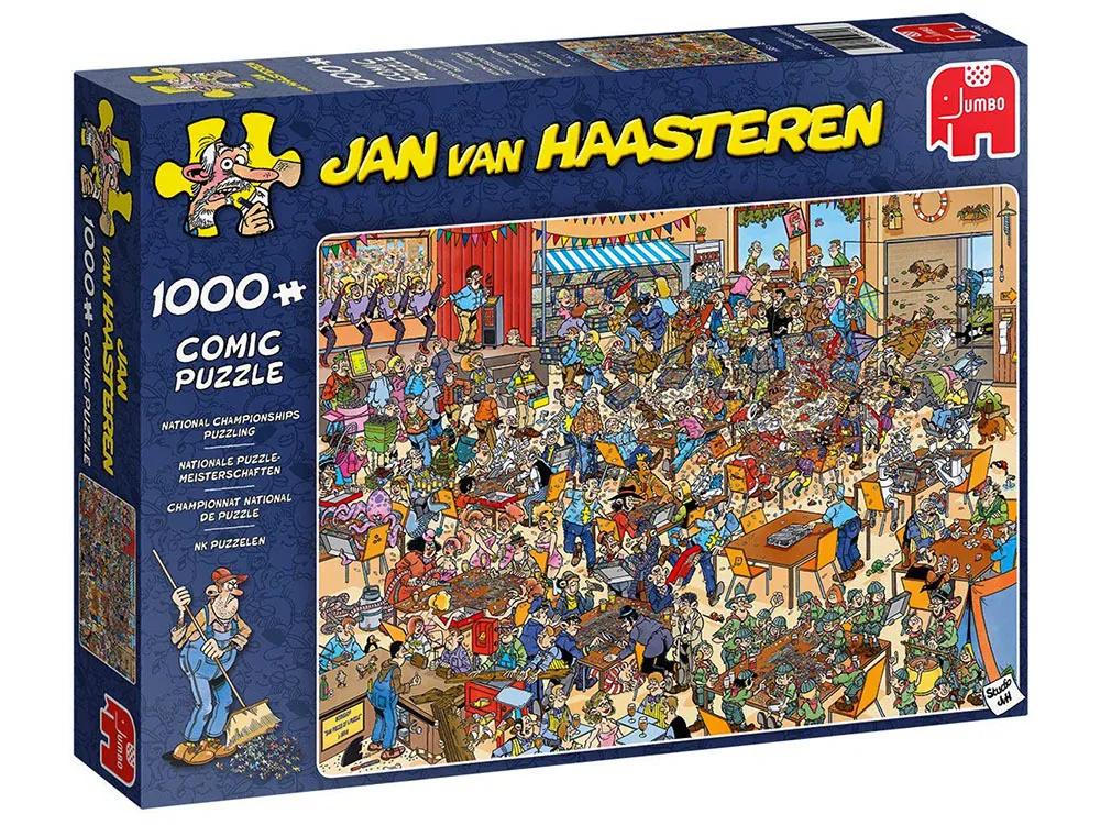 The National puzzling Championship' is the title of this Jan van Haasteren 1000 piece jigsaw puzzle and, as with all of his illustrations, you are sure to find this puzzle extremely enjoyable while laughing at all of the individual illustrations. The finished puzzle image captures a busy hall where the puzzle Championship is being held. As always Jan's humour has been put into This image, so keep an eye out! If this small taster of the illustrations in this 1000 piece puzzle sounds like your cup of tea, then don't miss out on the fun of piecing this puzzle together because there are many more hilarious illustrations to be enjoyed. the finished size of a 1000 piece puzzle measures 68 x 49cm (approximately) and the entire jigsaw puzzle has been produced using a high quality cardboard to ensure every jigsaw piece maintains its original shape during use and has a poster-like finish. Most of Jan's fans will immediately search for his trademark - the shark's fin - featured in every puzzle. But you can also look for Jan's other favourites - Saint Nicholas, The Hands, The Dentures and a self-portrait of Jan - that can be seen in nearly all of his puzzles. But if you have never puzzled a Jan van Haasteren before, then you can be sure to look out for these things. Size: 68 x 49 cm