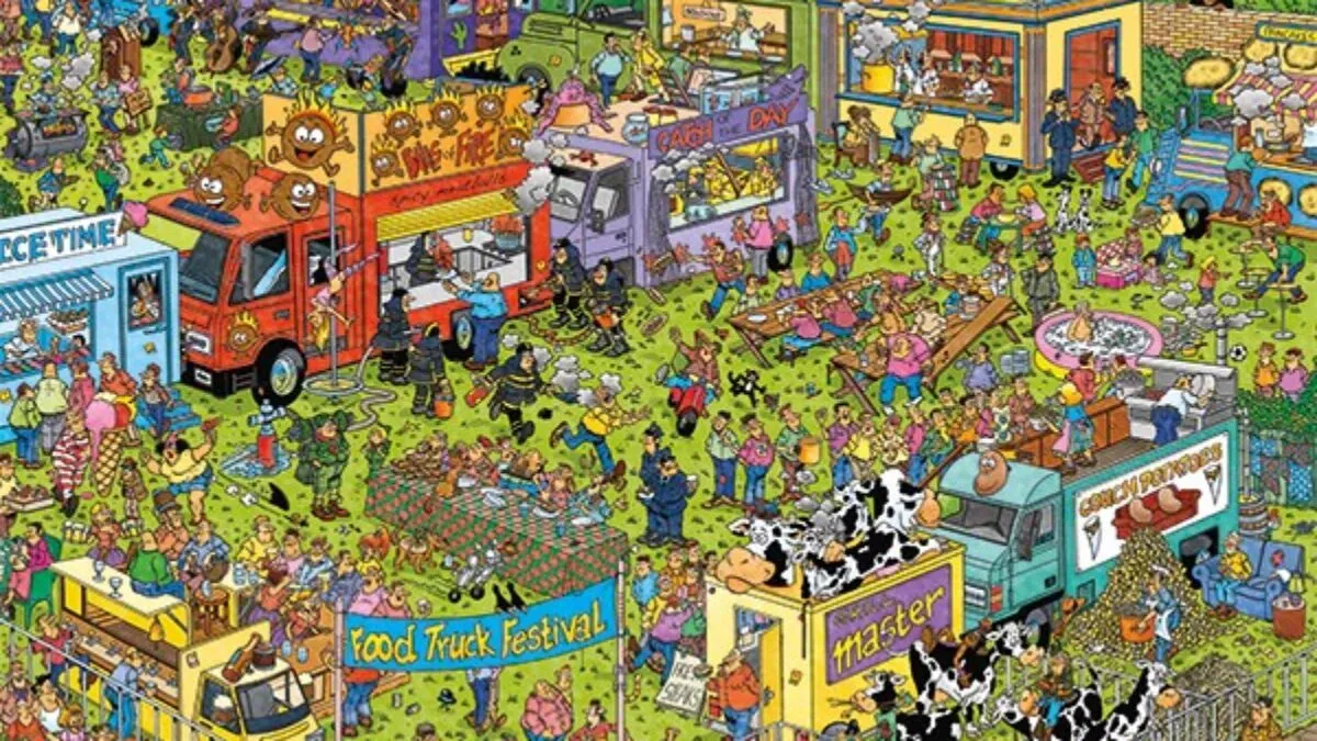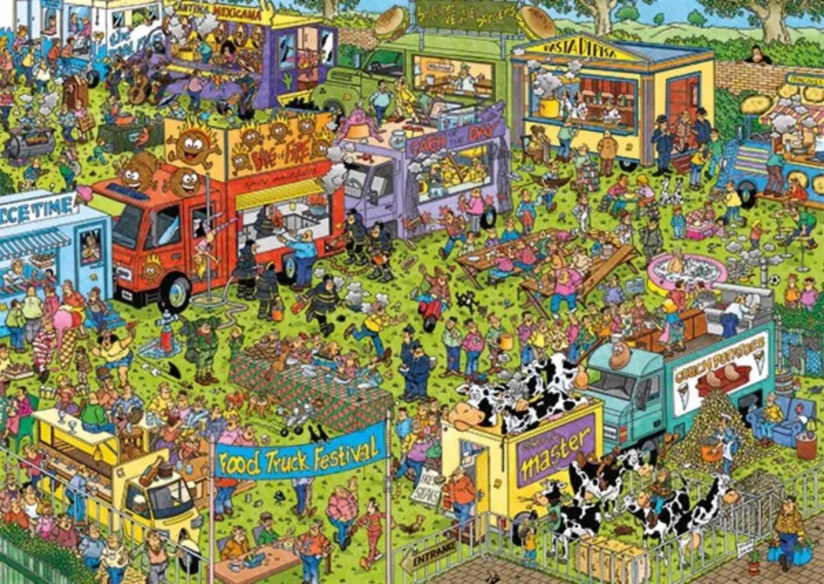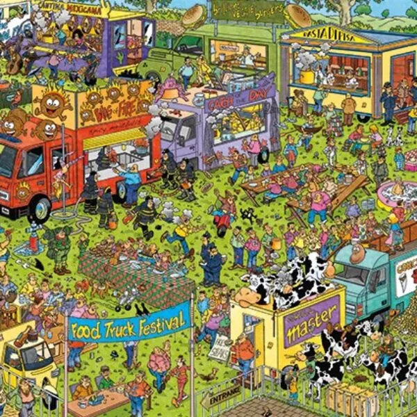 Jan Van Haasteren Food Truck Festival 1500 Piece Puzzle. For Decades Jan van Haasteren has created highly detailed, colourful, humorous illustrations