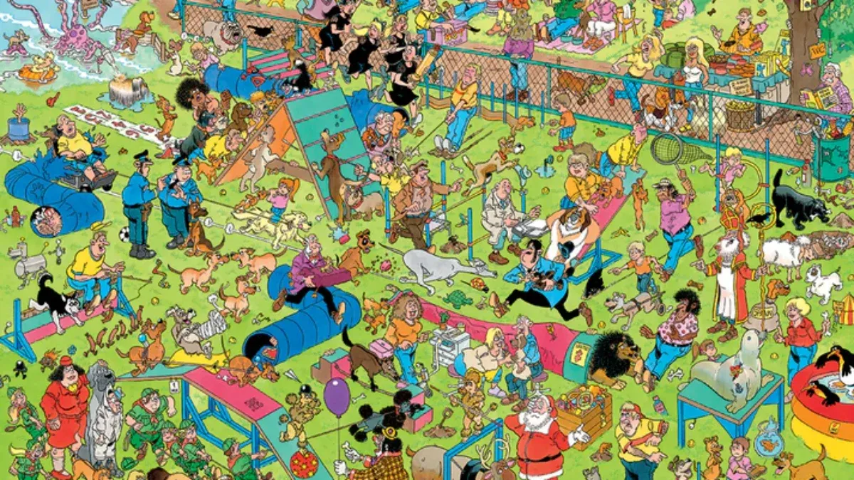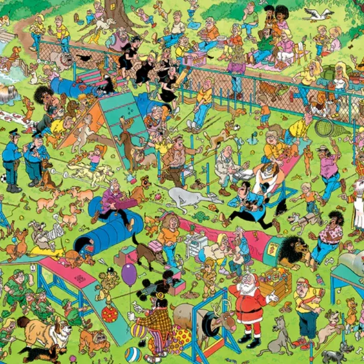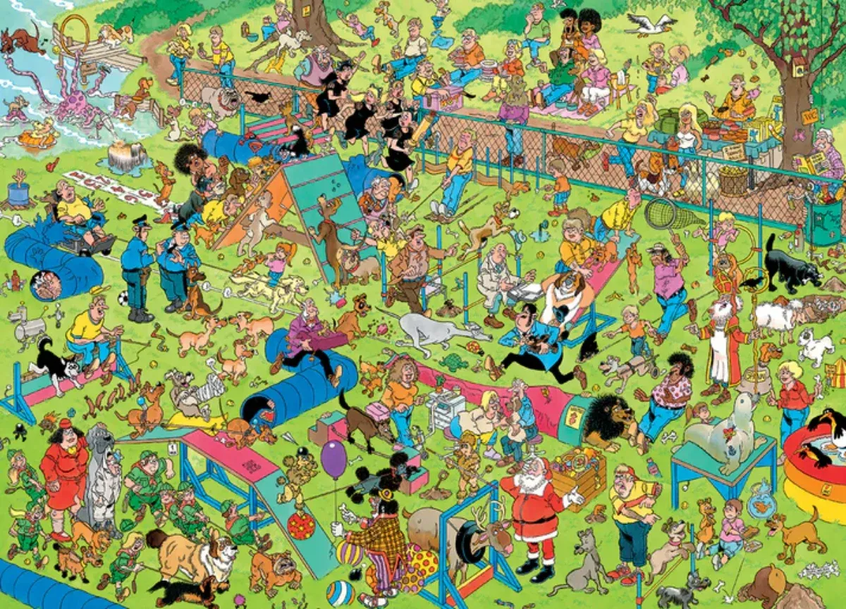 Jan Van Haasteren Dog Parkour 1000 Piece Jumbo Jigsaw Puzzle, The Jan van Haasteren family loves dogs and everyone has a blast on this course.