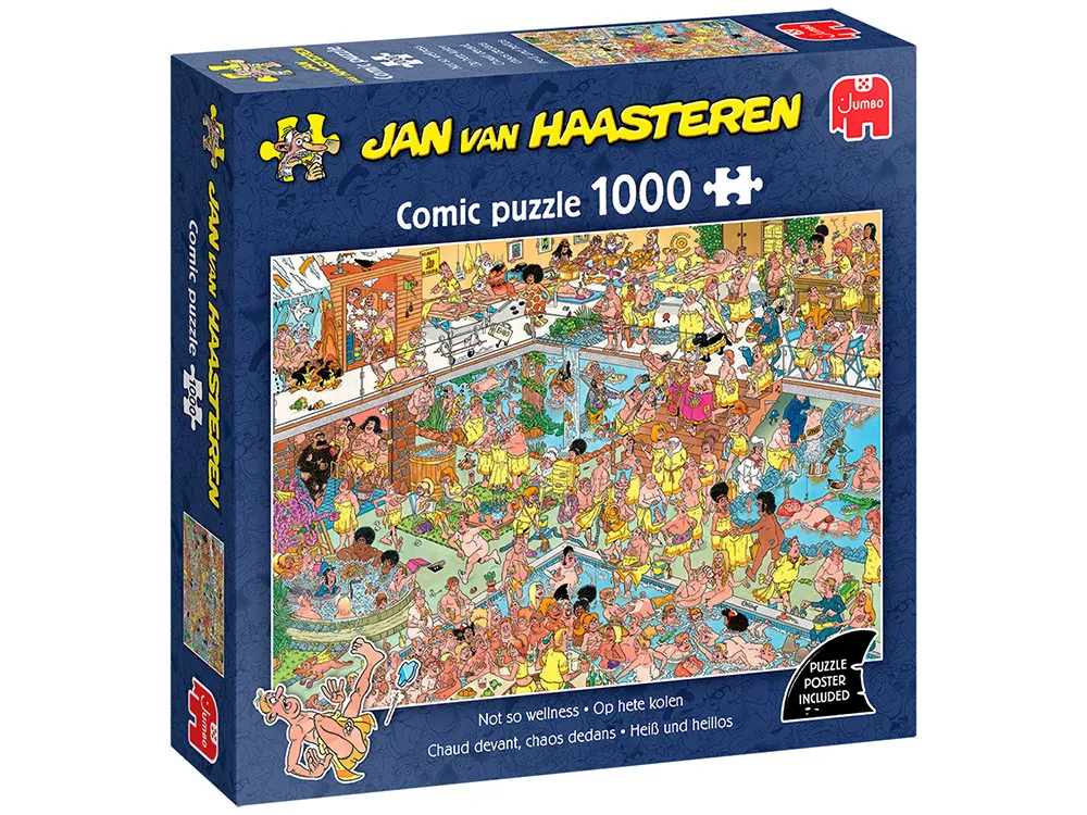 This will be a day to remember forever for the Jan van Haasteren family! It's quite a challenge to find your way among all the towels. The mother-in-law is having the time of her life, while Sinterklaas pampers Santa Claus with delightful hot stones. And Octo is completely in his element with all the water. Will this visit be worth repeating? A Jan van Haasteren puzzle is so much more than just a puzzle, its an adventure series with familiar characters playing the lead roles in a never-ending decor full of absurd details.