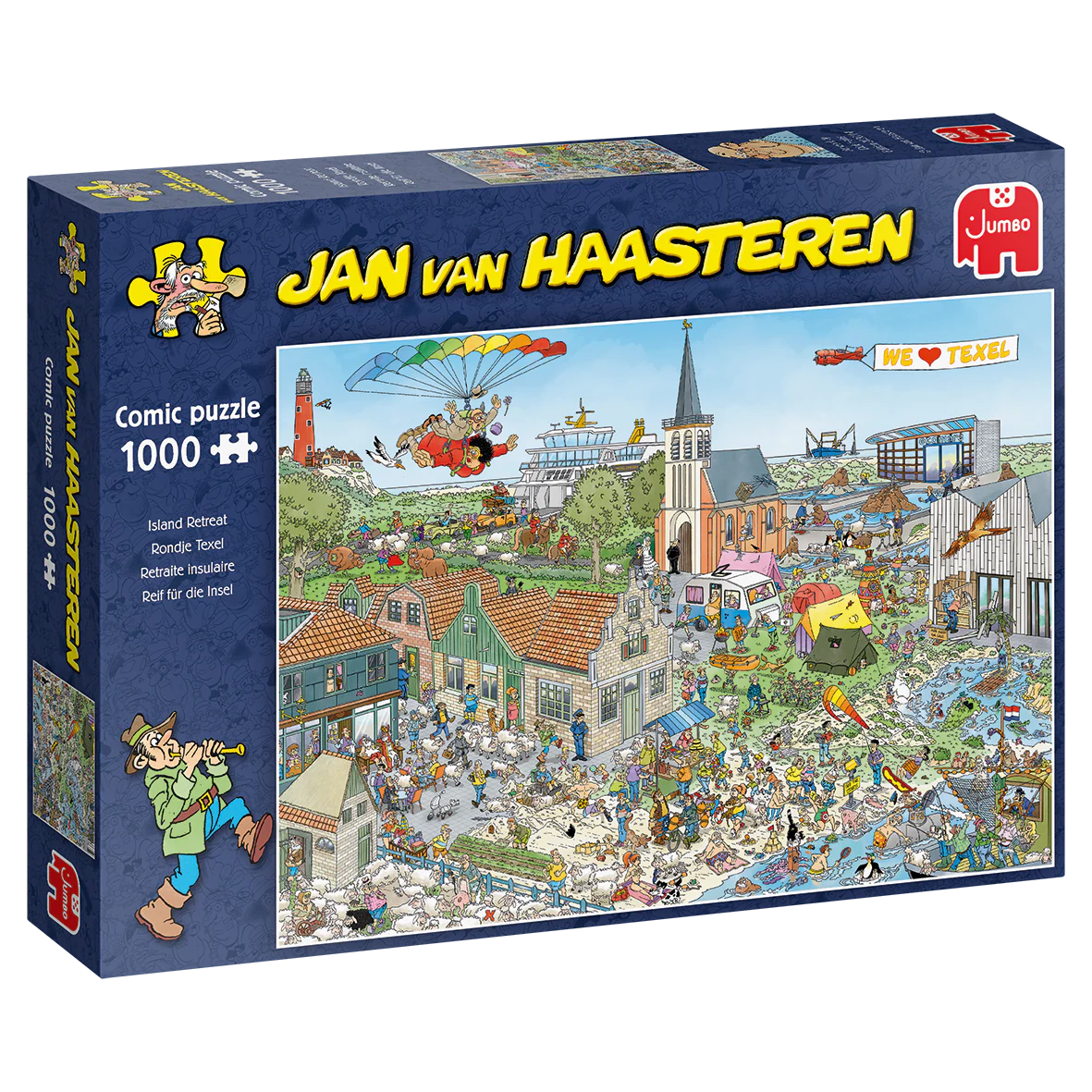 The Jan van Haasteren Family is embarking on a thrilling holiday adventure to the Isle of Texel. From exploring the majestic lighthouse to immersing themselves in the natural beauty and pristine beaches, there's an abundance of wonders to uncover. Even the grandparents are joining in the fun, taking their excitement to new heights with a thrilling skydiving experience! More than just a puzzle, a Jan van Haasteren puzzle is an immersive series filled with familiar faces and endless quirky details. Join the Jan van Haasteren family on their hilarious escapades, where every puzzle piece reveals a new layer of absurd fun!