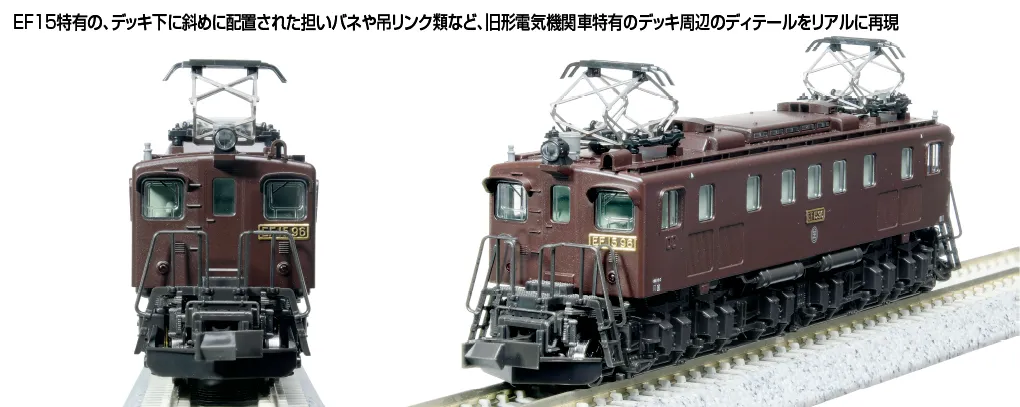 • The EF15's distinctive features, such as the diagonally positioned shoulder springs and suspension links beneath the deck, are realistically reproduced, along with the deck details unique to older electric locomotives.