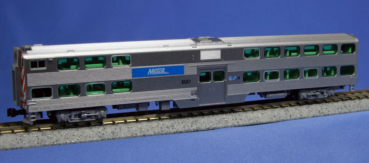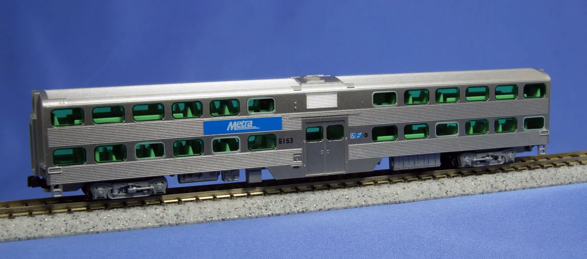 • Bi-Level cab coaches feature directional lighting for push-pull operation, with alternate illuminating headlight and taillights with an on/off switch for mid-train operation. An optional FL12 decoder can be installed in the place of the slider switch to provide DCC control over the directional lighting.