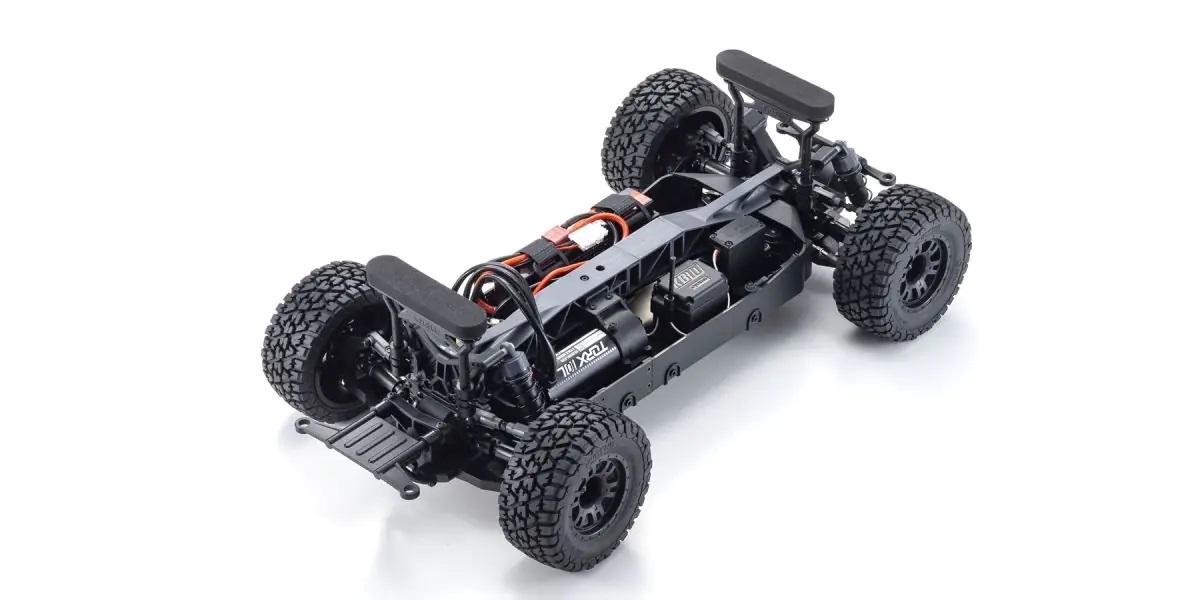 With rugged tires and undercarriage to handle rough terrain and a large rear cargo bed, pickup trucks are in high demand throughout North America, Southeast Asia, Africa, and Australia and many popular pickup trucks have been recreated as R/C models. Toyota developed the Tacoma mainly for the North American market and it has continued to sell well since its release in 1995. This model is based on the 3rd generation Tacoma which first appeared to much acclaim in 2016 due to its aggressive styling and practicality. The top of the range Tacoma TRD Pro has been recreated by Kyosho with a tough 1/10 scale chassis in a Readyset package. Kyosho’s molding craftmanship immaculately reproduces the TRD Pro body in lightweight but rigid polycarbonate resin with the strength for hard off-road driving. Based on the off-road KB10 chassis, the long wheelbase and short tread of the KB10L chassis matches the body perfectly. The shaft-driven 4WD system reliably transfers the brute power of the TORX10L brushless motor to reach top speeds of about 75km/h under the management of the ESC (Electronic Speed Control) and a compatible 3S (11.1V) lipo battery. This convenient Readyset package contains the fun of an ultra-scale pickup truck on a dynamic off-road chassis with a finish similar in quality to premium display-only models.