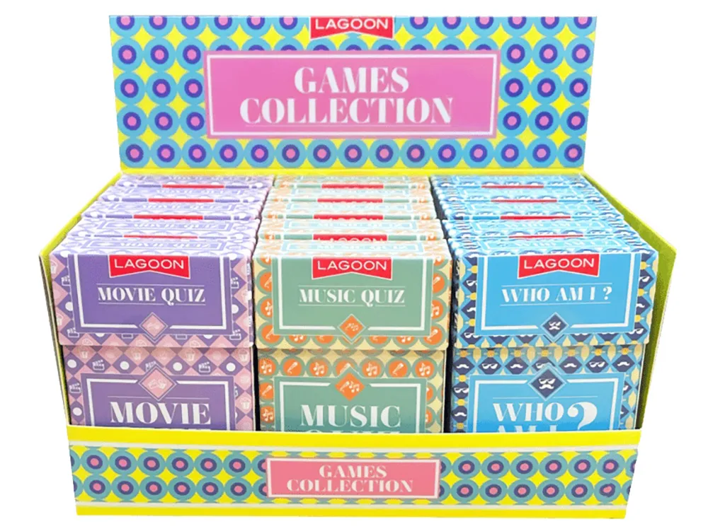 Three different titles: Movie Quiz, Music Quiz & Who Am I. Perfect card games for dinner parties. 100 questions in each box! In Movie Quiz players test their knowledge of the silver screeen. Music Quiz tests players recall of popular songs and artists. Who Am I gets players to act out and guess famous identities.