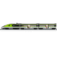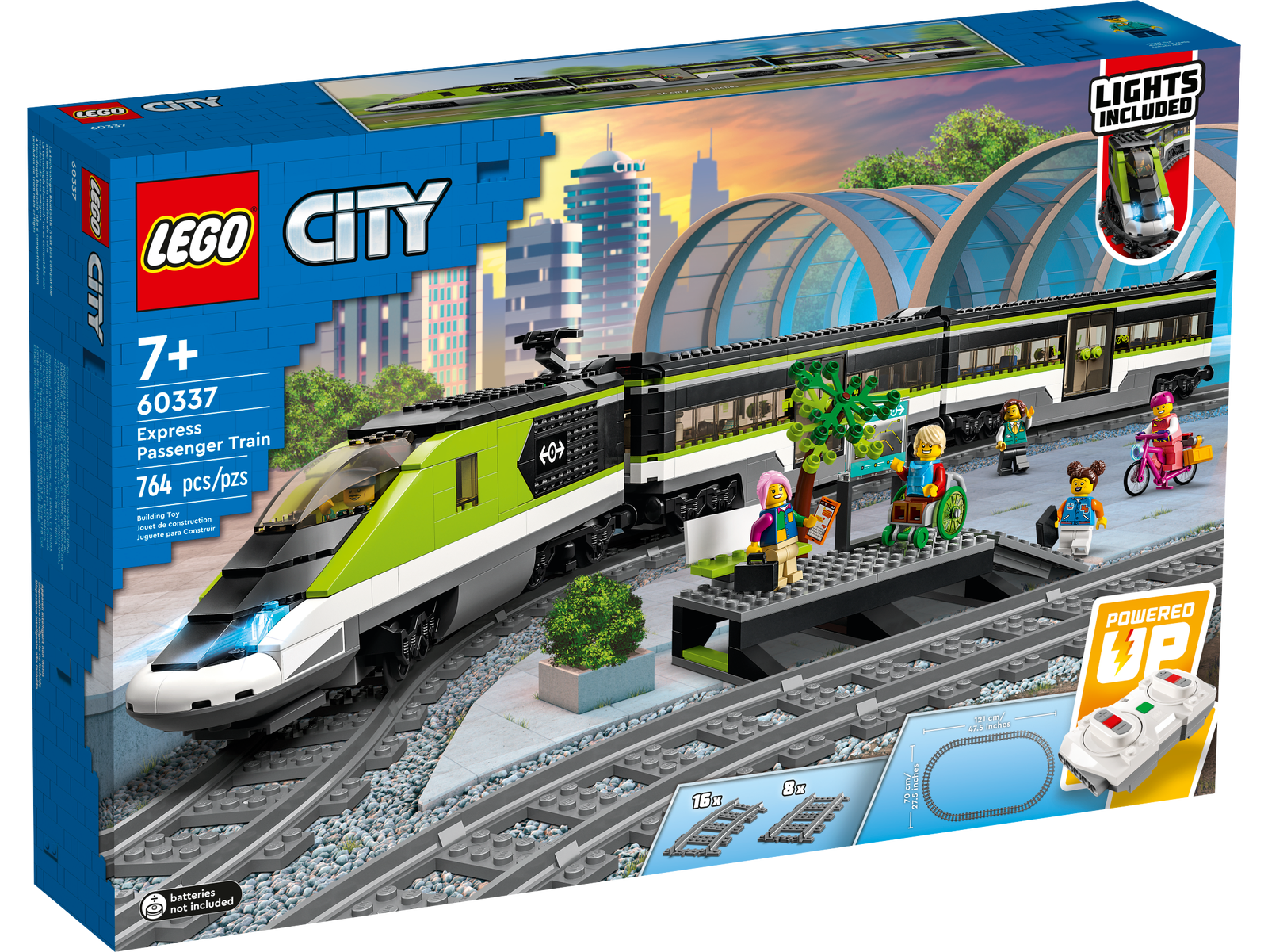The LEGO® City Express Passenger Train set (60337) includes a remote-controlled bullet locomotive with working, dimmable headlights and LEGO Powered Up technology, a dining car, passenger car, station platform, 24 track pieces and 6 minifigures for endless hours of train-themed role play.