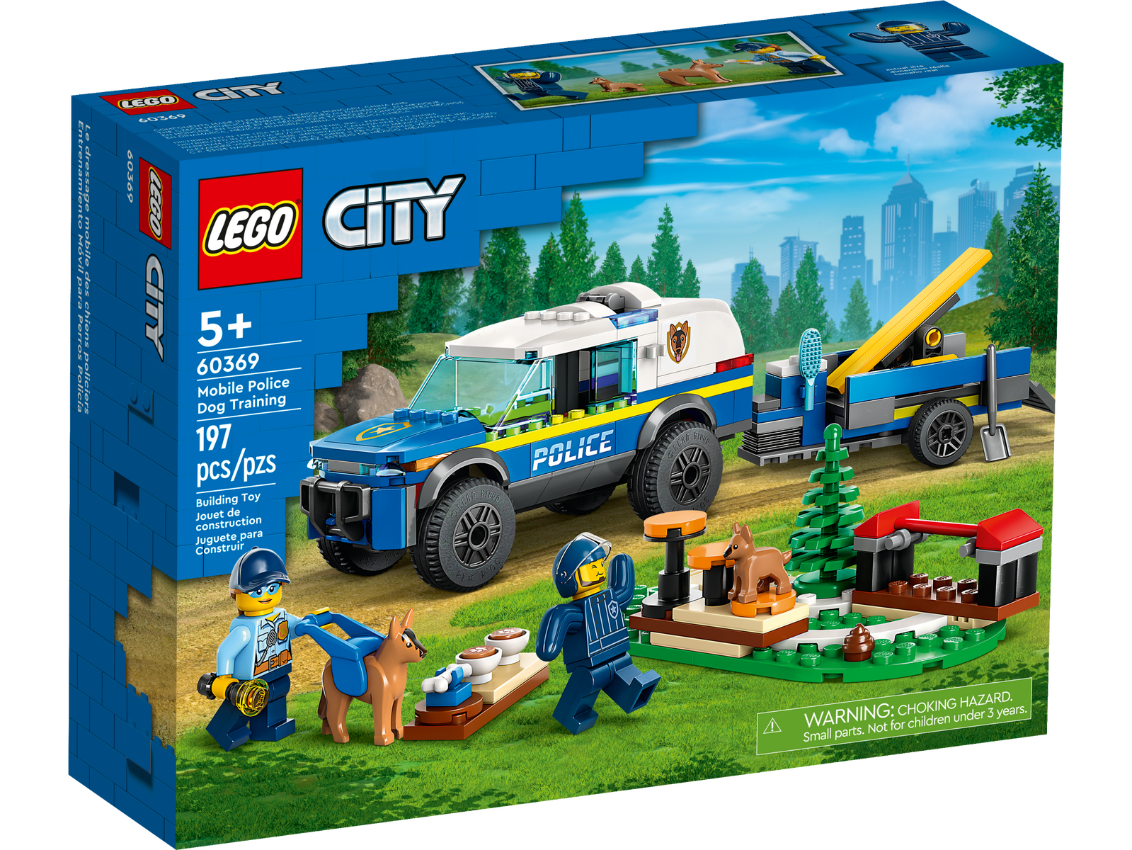 Kids and canine fans aged 5+ will love this LEGO® City Mobile Police Dog Training (60369) toy playset. Packed with inspiration for imaginative play, it comes with a K9 SUV, trailer and 3 dog-training apparatus, including a seesaw, jump bar and stepping paws. Just add the police officers and dog and puppy figures and let the fun begin. An immersive build and play experience Includes an easy-to-follow pictorial printed building guide and the LEGO Builder app – a digital building companion with intuitive zoom and rotate tools that enable kids to visualize the finished model from all angles as they build. The creative world of LEGO City LEGO City Police playsets deliver an enjoyable build-and-play experience with feature-rich buildings, realistic vehicles and fun characters that inspire imaginative, open-ended play. Police dog training playset – The LEGO® City Mobile Police Dog Training (60369) set is packed with inspiration for imaginative canine-themed play What’s in the box? – Everything kids need to build a toy police K9 SUV, trailer, 3 dog-training apparatus and a training ground setting, plus 2 minifigures, a dog figure and a puppy figure Fun features and functions – Training ground apparatus include a seesaw, jump bar and stepping paws A gift for any occasion – This LEGO® City Police Dog Training toy can be given as a birthday, holiday or any-other-day gift for kids aged 5 and up who love animals and police play Dimensions – The Police K9 SUV measures over 2.5 in. (7 cm) high, 5.5 in. (14 cm) long and 2.5 in. (6 cm) wide LEGO® minifigure accessories – This toy police playset comes with a grooming brush, flashlight, shovel and 2 toy dog treats Includes printed and digital building guides – Kids can zoom, rotate and view the models in this set from all angles as they construct them with the LEGO® Builder app for smartphones and tablets Building children’s creative skills – LEGO® City playsets help kids develop confidence and key life skills with buildable toys and characters that inspire open-ended imaginative play Quality in focus – All LEGO® components meet strict industry standards to ensure they are consistent, compatible and fun to build with: it’s been that way since 1958 Putting safety first – LEGO® bricks and pieces are dropped, heated, crushed,twisted and analyzed to make sure they meet stringent global standards for safety