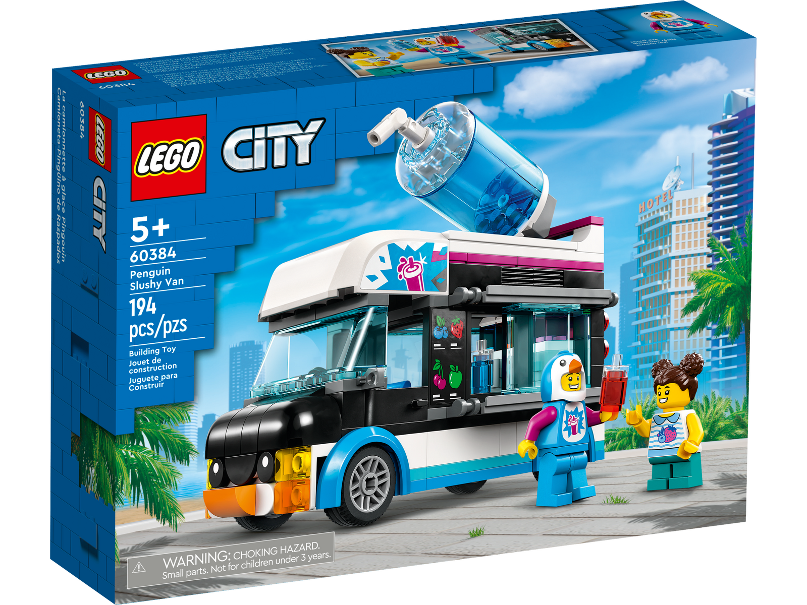 Bring a fun summer vibe to kids’ play with the LEGO® City Penguin Slushy Van (60384). This penguin-themed vehicle delivers lots of cool features and functions for imaginative play for ages 5+, including a prep area with 4 toy slushy machines and a sliding serving hatch. Just add the customer and penguin-suited vendor minifigures and let the fun begin! Includes digital building instructions This Penguin Slushy Van playset comes with an easy-to-follow pictorial building guide and the LEGO Builder app – a digital building companion with intuitive zoom and rotate tools that enable kids to visualize the finished model from all angles as they build. Exploring the world through play Kids grow up surrounded by amazing vehicles and machines, and with LEGO City Great Vehicles building sets they get to explore them up close, with realistic models and fun characters that inspire open-ended play. Vendor van playset – The LEGO® City Great Vehicles range just got cooler with this toy Penguin Slushy Van, featuring lots of authentic features and functions for hours of imaginative play What’s in the box? – Everything kids need to build the Penguin Slushy Van, plus 2 minifigures, including a penguin-suited vendor Just like the real thing – Kids can open the side of the van to access a prep area with 4 toy slushy machines and a sliding window for serving customers A fun toy with a summer vibe for kids aged 5+ – Give the LEGO® City Penguin Slushy Van (60384) playset as a birthday or any-other-day gift Dimensions – The Penguin Slushy Van measures over 5 in. (12 cm) high, 5.5 in. (14 cm) long and 2.5 in. (6 cm) wide LEGO® minifigure accessories – Toy accessories include a penguin hat for the vendor minifigure and 2 slushy cups Includes printed and digital building guides – Kids can zoom, rotate and view this model from all angles as they build it with the LEGO® Builder app for smartphones and tablets Kids learn as they play – LEGO® City toy building sets help kids develop confidence and key life skills as they build and play Toys you can rely on – All LEGO® components meet strict industry standards to ensure they are consistent, compatible and fun to build with: it’s been that way since 1958 Tested to the max – LEGO® bricks and pieces are dropped, heated, crushed, twisted and analyzed to make sure they meet stringent global standards for safety