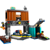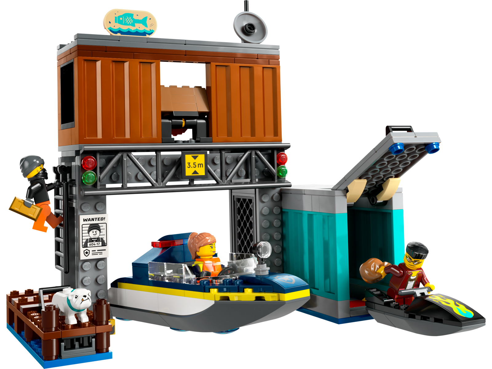 - What's in the box? - Everything kids need to build a toy speedboat, water scooter, dock setting with cargo containers, police officer minifigure, 2 crook minifigures and a bulldog figure