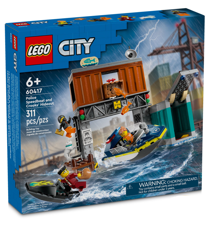 Crooks on the run with a police officer in pursuit make for great adventures in the LEGO City Police Speedboat and Crooks' Hideout (60417) set. It features a toy police patrol boat and a crooks' hideout hidden among old cargo containers at the city docks. Kids can join the officer onboard and discover an array of functions and surprises in a fun set that also includes a toy water scooter, dockside setting, a police officer and 2 crook minifigures, plus a bulldog figure.